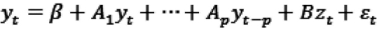 We applied unrestricted vector autoregressive (VAR) model to examine the relationship between mining revenue, government consumption, exchange rate and real GDP growth. This technique was popularized by Sims (1980). The VAR model provides a multivariate framework where changes in a particular variable are related to changes in its own lags and the lags of other variables. This is a reduced-form of VAR since the dependent variable is expressed in terms of predetermined lagged variables. The advantage of VAR approach is that unknown relationships between variables are considered as endogenous in the system as the variables relationship is simultaneously determined. The VAR model could be simplified as follows:
