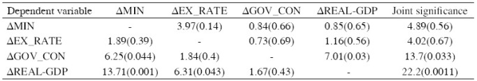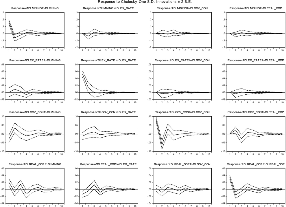 Johansen cointegration test consisting of trace and maximum-eigenvalue statistical tests was used to examine cointegrating relationship for economic growth, government consumption, exchange rate and mining. The results from both tests show that there is no cointegrating relationship among variables (Table 3). The absence of cointegration enables us to use vector autoregressive approach to investigate impulse response function, variance decomposition and granger causality relationship among variables.