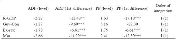 In time series analysis verification of the time series properties of data is necessary before any further analysis. The results of the stationarity test using Augmented Dickey Fuller (ADF) and Phillips and Perron (PP) are presented in Table 1. The null hypothesis of both tests (ADF and PP) is non-stationary against the alternative hypothesis of a stationary variable except for government consumption (LGov-Con). However, the results of ADF and PP tests are stationary at their first difference. Hence, variables are concluded to be integrate of order 1, technically known as I (1) process.