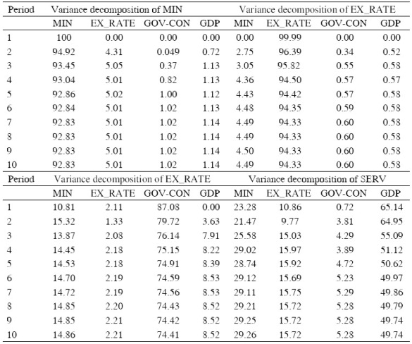 Impulse response functions results are presented in Figure A1 (see Appendix). The first row shows the response of mining revenue to shocks in exchange-rate, government consumption and real-GDP. Mining revenue was found to respond negatively to a shock in exchange rate from the first to the second quarter and positively in the third quarter, then the impact disappears. However, government consumption responds negatively in the first quarter and positively in the third quarter to shocks in mining revenue for the same period. The second row of Figure A1 (see Appendix) shows the responses of exchange rate to shocks in mining revenue, government consumption, and real-GDP. The exchange rate responds positively from the first to the third quarter to shocks in mining revenue and the impact disappears. These test results suggests that mining revenue resulted in appreciation of currency even though it is for a short run, while for government consumption and real-GDP the impact is negatively small and disappears after the fourth quarter. The third row in the same figure shows the response of government consumption to shocks in exchange rate, mining revenue and economic growth. Government consumption respond negatively in the first quarter, positively in the second and third quarter and the positive, negative pattern continues until the tenth quarter. The fourth row shows the response of economic growth to shocks in mining revenue, government consumption and exchange rate. The impulse response function suggests that mining revenue shock leads to positive response in the first quarter and negative in the second quarter, the pattern continues until the tenth quarter. The impact of government consumption on economic growth is positive in the first quarter, negative in the second quarter and the pattern continues until the last quarter.