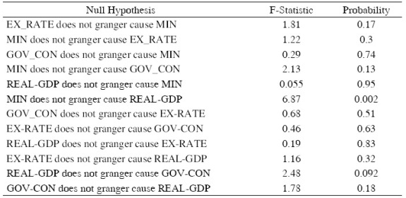 VAR Granger causality results are presented in Table 5. The VAR Granger Causality indicates that mining revenue and real-GDP granger causes government consumption and this is consistent with the findings for variance decomposition. Moreover, mining revenue and exchange rate granger cause real-GDP and this is also consistent with the findings for variance decomposition. Pairwise Granger Causality tests showed that mining revenue granger cause real-GDP thus a unidirectional causality running from mining revenue to real-GDP (Table B) in the appendix.