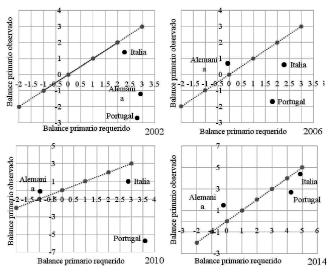 En la Figura 2, la línea recta representa los casos en que la deuda permanece estable porque son equivalentes el balance primario observado y el requerido, el grado de insostenibilidad de la deuda puede verse en la distancia de esta línea al punto que representa la situación de cada país. Visto así se observa que Italia y Portugal en el año 2014 se aproximan ya a la sostenibilidad, de forma más cercana en el caso de Italia; además se observa un considerable cambio en el grado de sostenibilidad de la deuda en el caso de Portugal entre los años 2010 y 2014.
