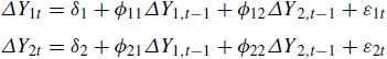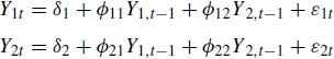 Puede observarse que cada variable es función lineal de los valores rezagados de ella misma y de las restantes variables incluidas. Cada variable regresando comparte el mismo grupo de variables regresoras. Esto permite interpretar la representación VAR como la forma reducida de un modelo estructural de ecuaciones simultáneas. Para la representación anterior, el modelo estructural correspondiente es: