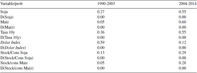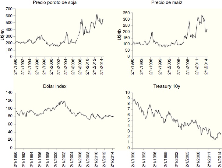 Tal como se mostró en capítulos anteriores, se parte de los determinantes estudiados por la literatura para especificar el modelo. Se eligen como variables la tasa de interés americana y la cotización del dólar. El precio del poroto de soja y del maíz surgen de los contratos de futuros operados en Chicago, nominados en dólares por tonelada (U$/tn), y la fuente de información utilizada es el Fondo Monetario Internacional. Para medir la cotización del dólar se utiliza el Dolar Index, el cual representa un índice que mide la fortaleza relativa del dólar ante una canasta de monedas extranjeras (yen, libra esterlina, dólar canadiense, corona sueca y franco suizo). Finalmente, la variable de tasa de interés está representada por la tasa a 10 años de los bonos americanos de madurez constante y la fuente de datos es la Fed de St. Louis.