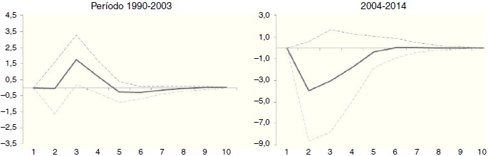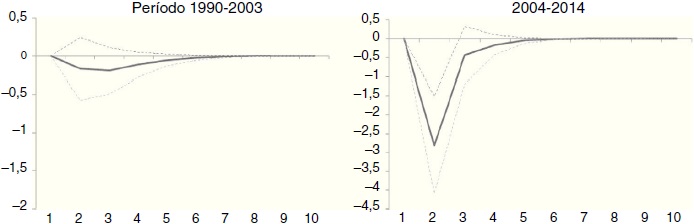 En tanto, tomando la misma división de la muestra se procede al estudio de la función de impulso-respuesta de la soja y el maíz ante un cambio en la variable Dolar Index. En las figuras 5 y 6 puede observarse que un shock de magnitud equivalente a un desvío estándar genera una reducción en los precios, tal como se espera ex-ante. No obstante, durante el período 1990-2003 el efecto se revierte rápidamente en los períodos subsiguientes. En tanto, entre 2004 y 2014 el impacto es mucho más pronunciado y persistente. Este hecho se registra tanto en soja como en maíz, aunque, al igual que con el shock de tasa, en la oleaginosa se amplifica el impacto.