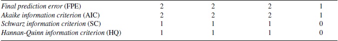 Una cuestión relacionada directamente con la efectividad de las respuestas de los coeficientes de impulso-respuesta es la determinación de los lags óptimos a utilizar en el modelo VAR. El estudio de Ivanov y Kilian (2005) presenta una excelente discusión sobre el criterio óptimo de selección. Se ha demostrado que la dinámica de las respuestas a los impulsos depende críticamente del orden de los lags elegidos que se ajusten a los datos del VAR. Estas diferencias pueden ser lo suficientemente grandes como para afectar la interpretación de las estimaciones. La estrategia más común en los trabajos empíricos es seleccionar un orden para el lag por algún criterio específico y condicionar las estimaciones sobre este a la hora de construir las funciones de impulso-repuesta. Se recomienda utilizar varios criterios de selección para determinar el orden correcto que mejor se ajuste a los datos. Todavía existe una discusión teórica sobre cómo proceder en el caso de que distintos criterios ofrezcan diferentes selecciones de lags. Los autores concluyen que para series mensuales la utilización de Akaike information criterion (AIC) es la adecuada para la selección. Llegan a esta conclusión para muestras de T = 600; cuando el T es menor, por ejemplo 240, el criterio de AIC es tan adecuado como el Hannan-Quinn information criterion (HQ). A los fines de este trabajo se prioriza en ambos criterios sin perder de vista el resto a los fines de ganar robustez.