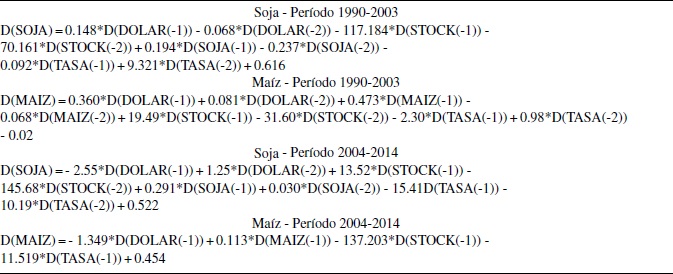 Una de las críticas al modelo VAR es que, dada su forma de construcción, la interpretación de los parámetros se vuelve compleja. No obstante, no es el objetivo de este trabajo la estimación de dichos parámetros sino comprender la respuesta de la soja y el maíz ante cambios en la tasa de interés y comprender si esa respuesta ha cambiado en los últimos años.