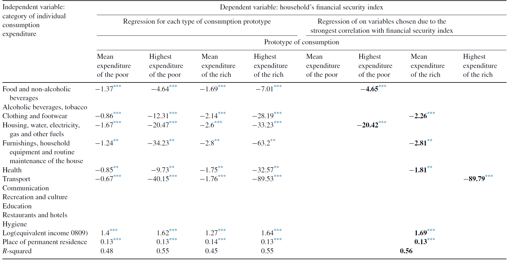 The findings suggest some patterns of consumption. In the period of 2005-2006 mean expenditure of the rich was the dominant prototype of consumption for the insecure poor (see Table 9 ). There were only three exceptions to it: the highest expenses of the rich for recreation, the highest expenses of the poor for transport and the mean expenses of the poor for health. In general, consumer behavior of the insecure poor was shaped by liking for the rich and the need to create the impression of attachment to the group with higher consumption. Only prototype of expenses on transport reveals the need to improve the household's self-image by having consumption at the highest level in own group.