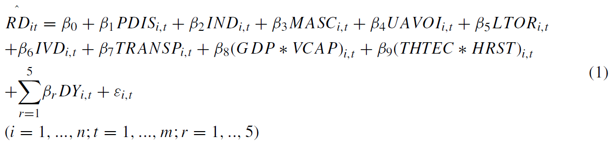 As already mentioned, the phenomenon under analysis evidences multiple associations as illustrated by the bilateral correlations. All variables, except LTOR, THTEC, and HRST, are not significantly correlated (p < α) with R&D. Thus, this primary overview confirms our assumption that culture and transparency influence R&D, mostly with the expected signals. THTEC is not associated with R&D (r = −0.036; p = 0.659), confirming that there is no bilateral direct association between R&D and high-technology trade. This evidence corroborates the outcomes provided by Chan et al. (2003) that there is no correlation between R&D expenditures and turnover derived from innovation. The human resources employed in science and technology seems to be an important driver of innovation, however not directly influencing the R&D expenditures and strategies.