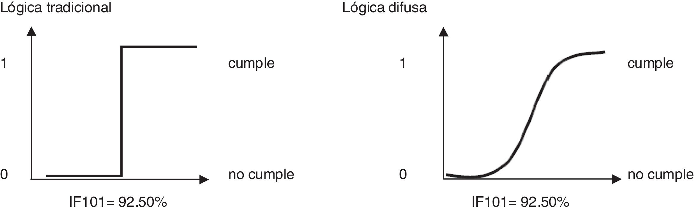 La figura 1 presenta de manera gráfica la interpretación de la información para la lógica tradicional y la lógica difusa, donde se puede observar el fuerte cambio que sufre la curva de transición entre los rangos propuestos. La búsqueda del orden dentro del caos lleva a la bifurcación; sin embargo, la lógica difusa produce un punto de rotura de la simetría, que lleva una geometría tradicional a términos fractales que describe un objeto geométrico, con grandes rangos de escala (Gil, 2000, 2005), es decir, pone énfasis en lo borroso de las variables, especialmente en lo cotidiano y empresarial por lo disonante con la realidad (Restrepo y Vanegas, 2015).