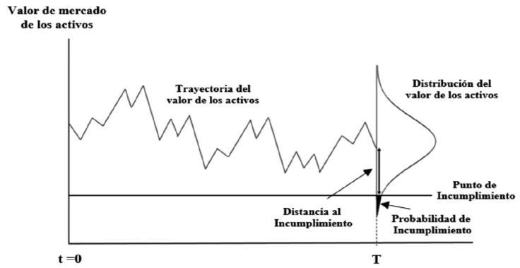 La Figura 1, muestra su aplicación a partir de la representación de una trayectoria posible del valor de mercado de los activos. Allí, se observa que, si el valor de los activos cae por debajo del punto de incumplimiento, entonces la empresa no tiene como pagar la deuda. Por lo tanto, la probabilidad de incumplimiento es la probabilidad de que el valor del activo se encuentre por debajo de este punto. Esta probabilidad está representada en el área sombreada de la función de distribución debajo del punto de incumplimiento.