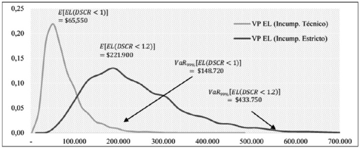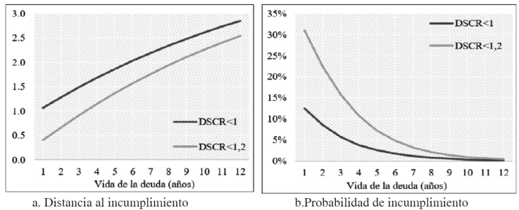 De esta forma, se ofrece a los bancos una herramienta útil para cuantificar el riesgo de crédito en proyectos de infraestructura. Cabe anotar que, dada la naturaleza compleja de un evento de incumplimiento en estos proyectos, el tratamiento del riesgo de crédito está fundamentado en los umbrales determinados por el DSCR, los cuales explican la ocurrencia de un incumplimiento “estricto” o “técnico”, este último justificado por la presencia de los covenants y derechos de control significativos para los bancos.