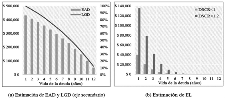De esta forma, el conocimiento de la dinámica de DSCR es suficiente para estimar la distancia al incumplimiento (DD). De igual forma, la dinámica de DSCR también se puede combinar con el servicio de deuda futuro para calcular el valor esperado y la volatilidad del flujo de efectivo futuro. A pesar de su estimación directa, tanto de DD como de la probabilidad de incumplimiento, los demás componentes de la EL pueden tener limitaciones que se deben señalar. Por lo general, los prestamistas, en su esfuerzo de reducir su exposición al riesgo, exigen al SPV la creación de cuentas de reserva de efectivo para cubrir parte del servicio de deuda futuro, lo cual aumenta su tasa de recuperación y reduce la exposición total en caso de un evento de incumplimiento. Por lo tanto, la estimación de estos componentes requiere un análisis por etapas, como se discutirá más adelante.