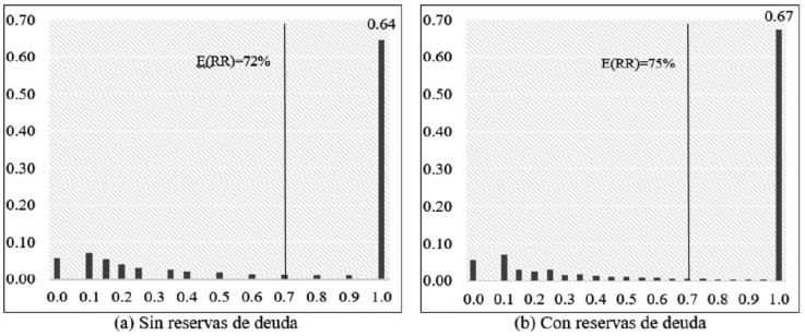 La incorporación de las reservas de deuda aumenta el valor de E[RR] de 72% a 75%, mientras que el número de escenarios en los que los bancos alcanzan una recuperación completa de la deuda pasa de un 64% a un 67%. Los resultados anteriores concuerdan con los análisis realizados por Moody’s (2017) y Jobst (2018), en los cuales se encuentra que la tasa de recuperación para el sector de infraestructura a nivel mundial (en promedio) está en el rango 70%-80%.