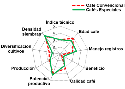 Al respecto se identificó que la proporción de productores de cafés especiales que tienen en sus fincas prácticas administrativas como la contabilización de costos, los volúmenes de producción, las facturas y los registros de venta, es mucho mayor que en los productores de café convencional (60% y 45%, respectivamente). Esto se debe, según los productores, al acompañamiento del servicio de asistencia técnica y al frecuente monitoreo de los procesos de auditoría. Asimismo, los productores de cafés especiales tienen mejores prácticas de beneficio del café, aunque para el caso de la muestra no se vio reflejado propiamente en la calidad. Sin embargo, la diferencia no fue estadísticamente significativa y además este parámetro se concentró sobre todo en la cantidad de subproductos resultantes del beneficio (pasilla), más que en las condiciones de inocuidad, el factor de rendimiento o la prueba de taza. A continuación, se resume el desempeño de la subdimesión técnica para los productores de café convencional y de cafés especiales (Figura 1).