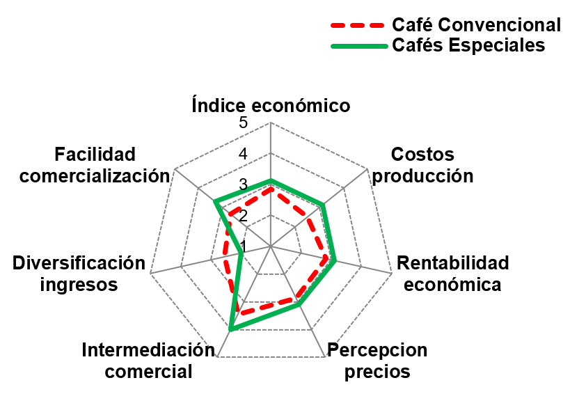 En ese sentido, es de esperarse que los productores que se someten a esos procesos de auditoria, mediante esquemas sostenibles, estén más satisfechos con el precio de venta y las garantías que obtienen en el negocio cafetero, tal como se pudo evidenciar en los resultados del estudio. De todos modos, un aspecto que resultó crítico en ambos modelos de producción ha sido en la posibilidad de generar ingresos adicionales que garanticen la sustentabilidad económica de las familias en temporadas improductivas. Esto explica que más del 70% de las fincas dependan exclusivamente del café y de algunos cultivos de pan coger. La situación parece más crítica en fincas productoras de cafés especiales. A continuación, se esboza un panorama del índice en la subdimesión económica para ambos tipos de productores.