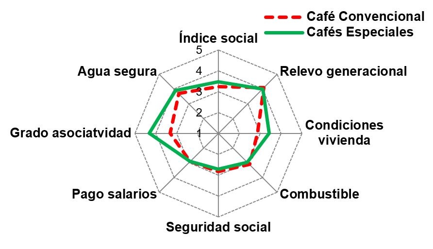 En los criterios sociales, los sistemas de auditoria con regularidad sopesan especialmente las condiciones de habitabilidad de los productores y la relación laboral con los trabajadores. Asimismo, se auditan parámetros como la vinculación al sistema de protección social, los temas de trabajo infantil, educación y la organización social en los entornos donde viven los caficultores. En ese sentido, el índice social de sostenibilidad fue mucho mayor en las fincas productoras de cafés especiales, sobre todo en términos de asociatividad, vinculación gremial y el entorno de habitabilidad. En todo caso, las ponderaciones del índice indican que, en materia social, ambos tipos de modelos productivos tienen un nivel medianamente sostenible frente al parámetro objetivo de evaluación. Esto se explica por la precariedad que se vive en general en las zonas rurales en términos de generación de ingresos y de cobertura del régimen de protección social. Al respecto se estima que, en promedio, una familia cafetera del conjunto de fincas analizadas tiene un margen de utilidad de poco menos de 400 dólares al mes para cubrir sus gastos básicos y reinvertir en el negocio. En adición, solo el 10% indica que tiene afiliación al sistema de pensiones y, aunque casi todos tienen cobertura en salud, ésta hace parte del régimen subsidiado por el Estado. No obstante, en las fincas estudiadas, el trabajo infantil resultó ser inferior al 20% y en condiciones de vigilancia por los padres. Además, donde se encontraron menores de edad, la tasa de asistencia escolar fue del 92%.