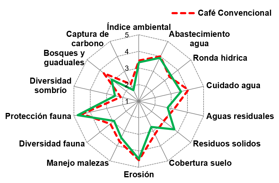 En términos generales, para la dimensión ambiental, aunque es una apuesta grande de las organizaciones que realizan procesos de auditoría para la certificación de calidad o la verificación del cumplimiento de los códigos de conducta en café, en la región estudiada no se advirtieron resultados contundentes de los cafés especiales frente a la producción de café convencional. No obstante, en prueba igualdad de varianzas, no se determinó que esas diferencias sean estadísticamente significativas. De todos modos, el resultado en esta dimensión se explica por el hecho de que la mayoría de las fincas productoras de cafés especiales de la zona de análisis se centra sobre todo en iniciativas de sostenibilidad social y económica que no tienen propiamente fines ambientalistas, como sí sucede con las certificaciones y sellos de calidad como Rainforest Alliance y Café Orgánico.