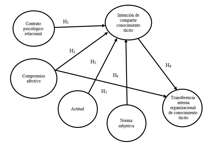 Cuando el conocimiento tácito se comparte, se genera uno nuevo, el cual se busca conservar, desarrollar, explotar y transferir al interior de la empresa para lograr el éxito organizacional (Arellano, 2015), ya que es el ingrediente primordial para la toma de decisiones que guían el rumbo de la organización. Cuando esto sucede, se generan ventajas en el desarrollo de habilidades y competencias, se incrementa el valor de la empresa, la innovación y sobre todo se generan ventajas competitivas sostenibles (Máynez, 2011; Loebbecke, Fenema y Powell, 2016; Tangaraja, Rasdi, Samah e Ismail, 2016). Por ello, la diferencia en la acumulación de conocimiento de las organizaciones servirá para aprovecharlo en conjunto con las habilidades de su personal, en el lugar y tiempo preciso (Arellano, 2015; Máynez, 2016), sin embargo, existen diversos factores que intervienen para que el conocimiento tácito se comparta y transfiera a distintos niveles organizacionales, dentro de los cuales se destacan aspectos personales tales como el compromiso del sujeto con la empresa y el contrato psicológico relacional o de comportamiento, ya que de acuerdo con la Teoría de la Acción Razonada de Ajzen y Fishbein (1972), la intención del sujeto para realizar determinada acción, debe ser evaluada mediante la observación de creencias tanto actitudinales como normativas, porque influyen directamente en su comportamiento al momento de tomar decisiones personales ante una situación planteada (Flores-Alarcón, 2018). Por lo antes expuesto, el objetivo de la presente investigación se enfocó en analizar si el compromiso afectivo, el contrato psicológico relacional, la actitud y la norma subjetiva afectan la intención de compartir conocimiento tácito y la transferencia interna organizacional de conocimiento tácito en colaboradores de la industria automotriz en la frontera norte de México.
