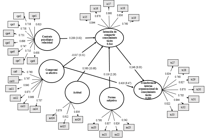 En el modelo estructural, que se muestra en la Figura 2, se presentan las cargas factoriales obtenidas de cada una de las variables observables y los valores path de las relaciones estructurales, en donde la relación del contrato psicológico relacional con la intención de compartir conocimiento tácito fue de 0.209, del compromiso afectivo con la intención de compartir conocimiento tácito fue de -0.017, de la actitud con la intención de compartir conocimiento tácito fue de 0.560, de la norma subjetiva con la intención de compartir conocimiento tácito fue de 0.119, la relación de la intención de compartir conocimiento tácito con la transferencia interna organizacional de conocimiento tácito fue de 0.248 y la relación del compromiso afectivo con la transferencia interna organizacional de conocimiento tácito fue de 0.416.