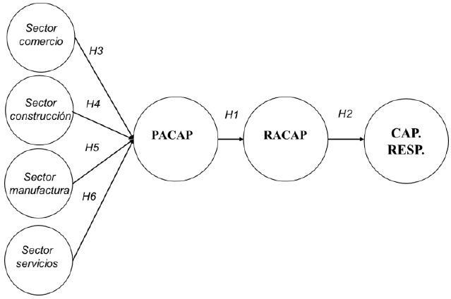 En este sentido, el artículo se organizó de la siguiente manera. Primero se expone la revisión de la literatura sobre los conceptos de capacidades potenciales, reales y de respuesta. Para así, identificar las hipótesis de trabajo, así como el modelo teórico diseñado. Acto seguido, expone la metodología seguida en esta investigación que empleó la correlación de Pearson y el análisis de ecuaciones estructurales con mínimos cuadrados parciales (SEM-PLS). En tercer lugar, se muestran y discuten los resultados. El documento concluye resumiendo los hallazgos de este estudio y describe las implicaciones para futuras investigaciones.