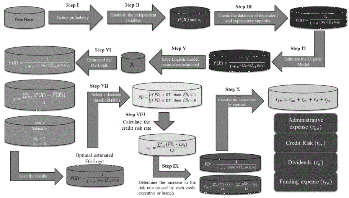 This method uses the FG-Logit model to obtain the parameters that recognize the effect of the regressors and assess the probability of default. The proposed risk management model consists of three fundamental phases: