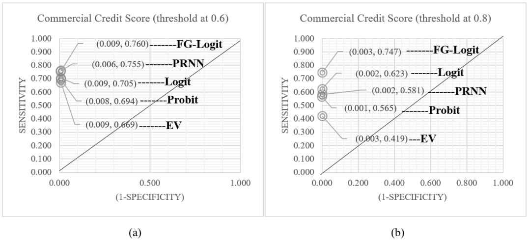 Figure 3 Comparison of ROC Curve. (a) depicts the models’ rank in the space of the ROC curve at a threshold of 60% probability of default.; (b) describes the models’ rank in the space of the ROC curve at a threshold of 80% probability of default.
