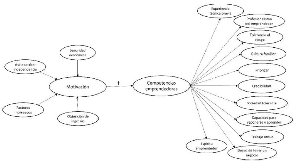 Así en esta investigación, se consideran a las competencias emprendedoras como las características que definen el comportamiento del emprendedor y contribuyen al desarrollo de su emprendimiento (Alda-Varas et al., 2012). Las cuales están estrechamente relacionadas con la motivación y la autopercepción del individuo, lo que influye en su personalidad empresarial y la identidad emprendedora en su entorno social (Mahto y McDowell, 2018). Las capacidades internas de las personas mejoran su desarrollo empresarial y posibilidades de éxito, al unirse con la motivación para tener un negocio propio (Paredes, 2019). La relación entre la motivación y las competencias emprendedoras lleva al individuo a desarrollar y sostener su emprendimiento con base en sus metas personales, como la cultura familiar o el deseo de tener un negocio (Rahmatullah y Zaman, 2014; López et al., 2016). Al final, la razón para emprender y hacer del negocio su forma de vida y medio de subsistencia es lo que determinará la implementación de estas competencias y motivaciones.