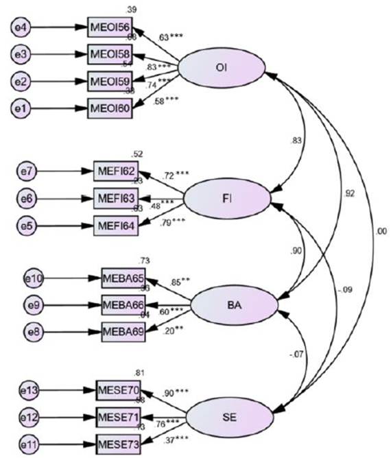 En el constructo "Motivación", que inicialmente constaba de 18 ítems, para lograr una buena bondad de ajuste, se eliminaron 5 ítems identificados como MEOI57 (Obtención de Ingresos), MEFI61 (Factores Intrínsecos), MEBA67 y MEBA68 (Búsqueda de Autonomía) y MESE72 (Seguridad Económica). Así, solo se utilizaron 13 ítems para explicar el constructo (véase Figura 2). Estos valores indican que el modelo se ajusta adecuadamente al analizar constructos que miden aptitudes y actitudes en las ciencias sociales (Padilla, 2019). A pesar de eliminar los elementos mencionados, la teoría propuesta por López et al. (2016) sigue siendo coherente con los datos obtenidos en este estudio para esta población.