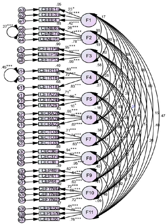 Se identificaron correlaciones fuertes entre los ítems CENE6 y CENE7 de "Necesidad de Existir" y entre los ítems CETR15 y CETR16 de "Tolerancia al Riesgo". Para abordar estas correlaciones, se realizaron contracciones de los ítems relevantes. Se pudo determinar que la teoría concuerda con los datos de este estudio, pues se mantuvieron las 11 dimensiones de Palacios (1999), como se muestra en la Figura 3. Sin embargo, para esta población de estudio, no todos los ítems fueron necesarios para explicar cada dimensión de la variable.