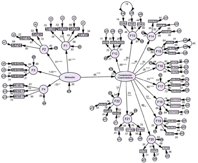 Nota 1: Relación de motivación y competencias emprendedoras = 0.48. Razón de discrepancia= 2.315, RMSEA= 0.079, CFI=0.77. *p<.05, **<.01, ***<.001