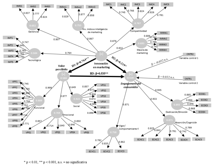 Este trabajo buscó explicar los efectos de la percepción de la Innovación en marketing sobre el Valor percibido y el Engagement del consumidor. La hipótesis 1, afirma que la Innovación en marketing (IM) afecta positiva y significativamente al Valor percibido (VP), y como se muestra en los resultados, tal hipótesis se comprobó, esto significa que cuando el consumidor percibe que existe una Innovación en marketing en tecnología, aspectos de gerencia, investigación e inteligencia de mercados, competitividad y en la mezcla de marketing, entonces mejora el Valor percibido respecto a diversos atributos, como el precio y la calidad del producto, así como cuestiones internas del consumidor, y aspectos sociales y emocionales. Este resultado coincide con otras investigaciones que han identificado que la Innovación crea y genera valor (Herskovits, 2015; Widjojo et al., 2020) tanto co-creado como compartido (Kanagal, 2015). Trabajos como los de Mohr (1969) y Vargo y Lusch (2004, 2008) también han sustentado este efecto, argumentando que deben medirse desde la demanda, ya que para que un invento se transforme en innovación y tenga efecto sobre el valor deben ser adquiridos en el mercado.