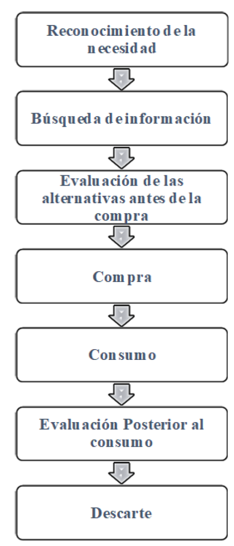 El modelo de proceso de compra del consumidor (PDC) fue desarrollado en los años ochenta por Roger D. Blackwell, Paul W. Minard y James F. Engel. En este modelo se presenta la naturaleza de la toma de decisiones del consumidor y las influencias que las afectan. Las decisiones del consumidor, analizadas a través de este modelo señala que el proceso se mueve a través de siete etapas: 1) Reconocimiento de la necesidad, 2) Búsqueda de información, 3) evaluaciones de las alternativas antes de la compra, 4) compra, 5) consumo, 6) evaluación alternativa posterior a la compra y, 7) descarte. Como se puede observar en la Figura 1.