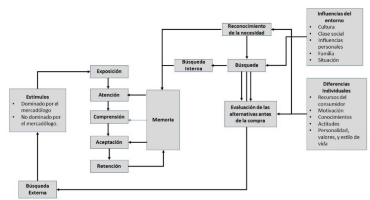 El modelo señala que la compra y el consumo están afectadas por un conjunto complejo de factores que influyen y forman el comportamiento del proceso de decisión, incluyendo entre estos factores las diferencias individuales y la influencia del entorno. por lo que a continuación se detallan las principales características de este submodelo en la Figura 2.