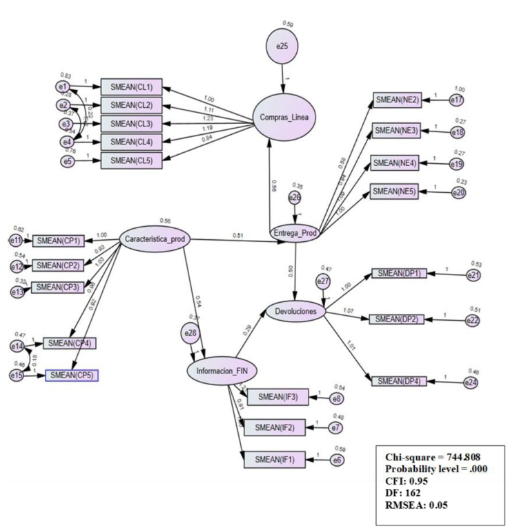 El resultado de las pruebas de hipótesis es mostrado en la Tabla 5, donde podemos apreciar que la Información General de la compra en línea (CL), la Información Financiera (IF), las Características del Producto (CP), el No envío del producto (NE) y la Devolución del Producto (DP), tienen un factor de impacto significativo con relación a lo que el consumidor mexicano considera al momento de evaluar las alternativas de productos y/o servicios en línea. Por ello, se determina llevar a cabo el análisis de datos a través de modelos de ecuaciones estructurales (SEM) con la finalidad de dar explicación de los fenómenos de mercadotecnia, Steenkamp y Baumgartner, (2000). Con ello se puede señalar que factor tiene un impacto significativo en cuanto a que el consumidor mexicano considera al momento de evaluar las alternativas de productos y/o servicios en línea.