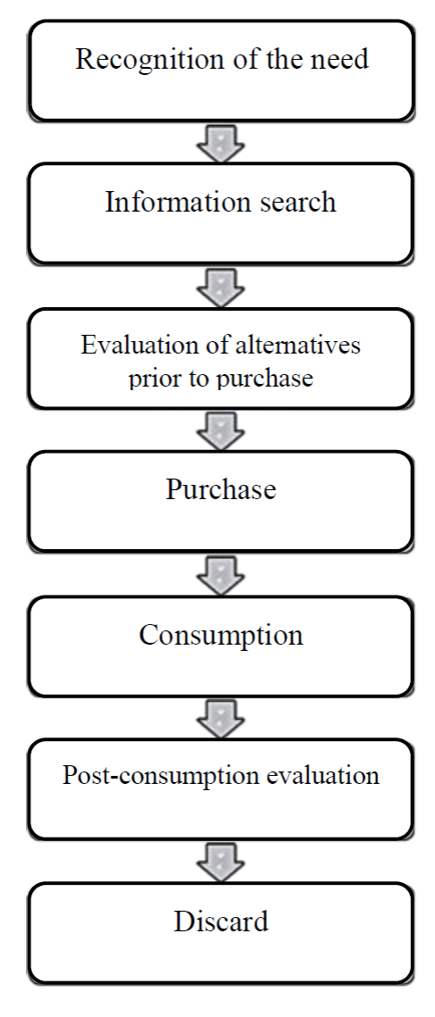 The consumer buying process (CBP) model was developed in the 1980s by Roger D. Blackwell, Paul W. Minard, and James F. Engel. This model presents the nature of consumer decision-making and the influences that affect it. Consumer decisions, analyzed through this model, show that the process moves through seven stages: 1) recognition of the need, 2) information search, 3) evaluation of alternatives before purchase, 4) purchase, 5) consumption, 6) post-consumption alternative evaluation, and 7) discard, as can be seen in Figure 1.