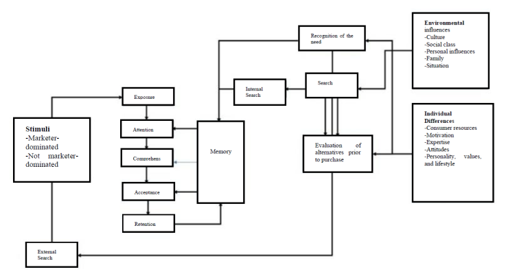 Howard and Sheth’s (1969) model attempts to explain the process by which a consumer transforms, through learning mechanisms, commercial stimuli into triggering reactions to those stimuli. According to this model, after an initial search for product information, consumers compare the different alternatives, resulting in a learning process that ultimately impacts their decision-making.