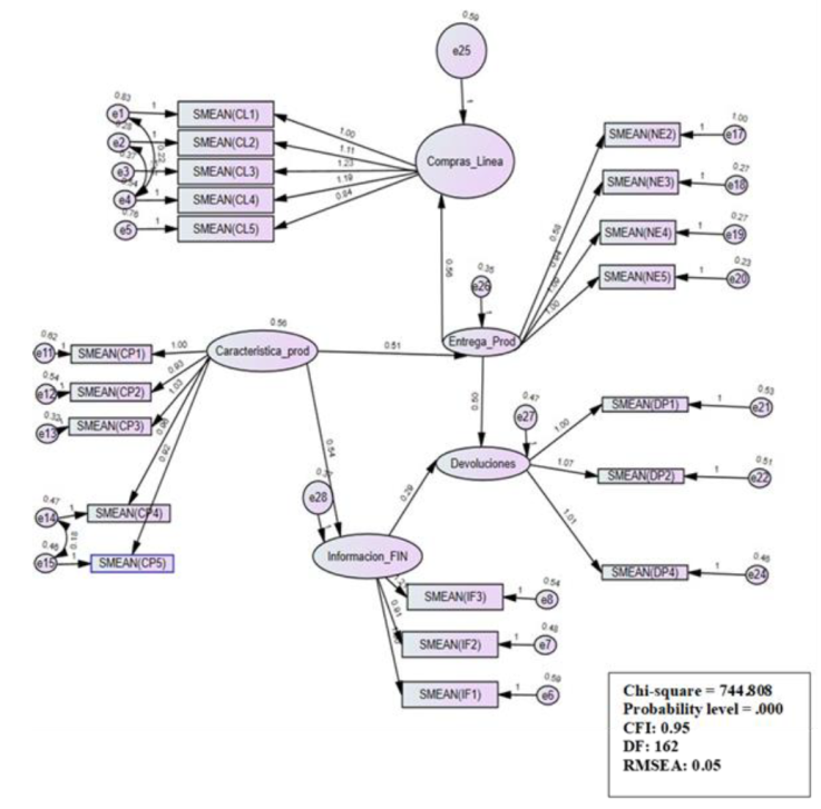 El objetivo de la investigación fue analizar los factores que afectan el comportamiento de compra en línea en consumidores mexicanos, se aborda la percepción de inseguridad en la elección del producto, el pago, la entrega y la política de devolución. La metodología empleada fue cuantitativa, transversal, aplicada, no experimental mediante encuesta autoadministrada con escala de Likert de cinco puntos para recopilar datos empíricos de 278 compradores en línea utilizando muestreo por conveniencia, obteniendo el alfa de Cronbach de 0.88; Para el análisis se utilizó el software SPSS y AMOS 29, para probar el modelo utilizando las pruebas de bondad de ajuste: AIC= 375.85; NFI=0.90; CFI=0.95; GFI=0.91; AGFI=0.88; RMCR=.006; RMSEA=0.05; α=.885 Los principales resultados indican que el envío, la devolución y las características del producto son factores significativos, por lo que se concluye que la información financiera no es significativa, al momento de evaluar las alternativas de compra en línea.