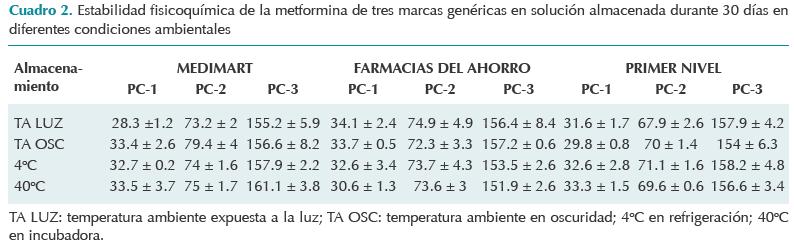 Resultados: todas las marcas comerciales de metformina fueron estables bajo todas las circunstancias de almacenamiento hasta por 30 días. Conservaron más de 90% de la cantidad inicial de fármaco activo, con un pH de 7.4 ± 0.3.