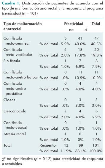 Mostraron efectividad (evacuaciones fecales diarias sin manchado o accidentes fecales y radiografía simple de abdomen posevacuación sin residuo fecal) 89 de los 101 pacientes (88.1%) incluidos en el PRI al término de las 3 semanas de seguimiento promedio. No mostraron buena respuesta clínica ni radiológica 12 de los 101 pacientes (11.9%) incluidos en el PRI, persistieron los residuos fecales en el recto o colon izquierdo en la radiografía simple de abdomen posevacuación, así como el manchado fecal (cuadro 1). No encontramos diferencia estadísticamente significativa en relación con la efectividad del tratamiento entre los diferentes tipos de malformación anorrectal (χ2 p = 0.12).