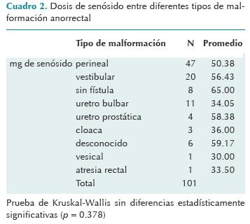 Finalmente, no consideramos recomendar una dosis ponderal, ni dosis diaria de los senósidos para el tratamiento del estreñimiento en niños con MAR, ya que en el análisis por grupos etarios estos valores no mostraron distribución normal. Existieron casos con valores extremos importantes en cada grupo quizá por la distinta severidad del estreñimiento debido al tipo de malformación anorrectal, edad al momento de la corrección quirúrgica, presencia de megarrecto, etcétera. Pero sí podemos afirmar que existe efectividad en el tratamiento del estreñimiento de los niños con malformación anorrectal usando senósidos, que la dosis ponderal es distinta en cada uno de los pacientes y que ésta debe ser modificada en las consultas médicas de seguimiento de acuerdo con la respuesta del paciente.