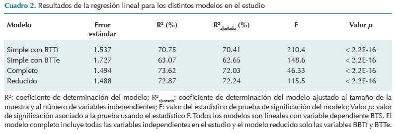Se realizó un análisis de regresión simple entre BTS y BTTf y se obtuvo el modelo lineal que llamamos "modelo simple con BTTf", BTS = 2.1187 + 0.7035 × BTTf. Se repitió el mismo análisis tomando como variable independiente a BTTe y se obtuvo el modelo lineal que llamamos "modelo simple con BTTe", BTS = 2.0405 + 0.6349 × BTTe, ambos modelos fueron estadísticamente significativos con valores F asociados de 210.4 y 148.6, respectivamente; y un valor p < 2.2 E-16 en ambos casos. En los dos primeros renglones del cuadro 2 se muestran los valores de error estándar, R2 y R2ajustado para estos modelos.