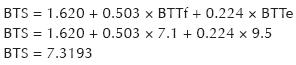2. Estimación de BTS al sustituir los valores obtenidos de BTTf y BTTe en la fórmula del modelo reducido (BTS = 1.620 + 0.503 × BTTf + 0.224 × BTTe).
