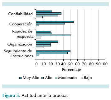 Respecto a la actitud ante la evaluación 50% de médicos tuvo alguna dificultad para seguir instrucciones adecuadamente; 31.8% logró organizarse ante la prueba y 33% mostró confiabilidad alta en las respuestas (figura 5).