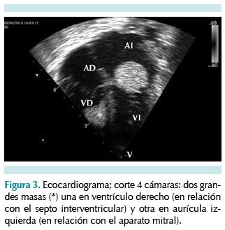 Los tumores intracardiacos son poco frecuentes en niños y más aún en los neonatos. La mayoría de este tipo de lesiones son rabdomiomas; usualmente son múltiples y de diferentes tamaños, de localización ventricular y muy rara vez se encuentran en las aurículas. Los rabdomiomas se pueden asociar con esclerosis tuberosa de 56 a 86% de los casos.