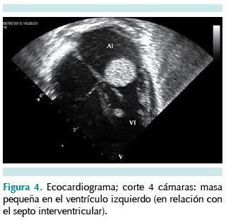 El ecocardiograma reportó anatomía segmentaria normal. Foramen oval permeable de 2 mm con cortocircuito restrictivo de izquierda a derecha, con gradiente instantáneo máximo de 18 mmHg y gradiente medio de 9 mmHg. Se observaron tumoraciones intracardiacas múltiples sugestivas de rabdomiomas. La mayor de ellas, en la aurícula izquierda, redondeada, de 15 × 12 mm, muy cercana a la válvula mitral. Cabe destacar que las masas intraauriculares se encuentran en menos de 1% de los casos reportados en la literatura especializada. Se encontró otra tumoración en el ventrículo derecho, más pequeña (10 × 8 mm), de aspecto bilobulado, dependiente del septo interventricular; dos más en el ventrículo izquierdo, una en el tercio medio del septo interventricular, de 4 × 4 mm, redondeada, y otra de 6 × 3 mm en la base del músculo papilar. (Figuras 3, 4 y 5)