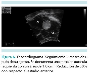 Durante su estancia la paciente presentó una evolución clínica favorable, fue alimentada de forma habitual con seno materno; no se documentaron episodios de crisis convulsivas. Recibió tratamiento médico con captopril (0.025 mg/kg 3 veces al día), furosemida (0.5 mg/kg 3 veces al día) y espironolactona (3 mg/kg/día). Fue evaluada por genética, oftalmología, dermatología y neurología. Se estableció el diagnóstico de esclerosis tuberosa de acuerdo con los criterios establecidos en la Conferencia de Consenso sobre el Complejo de Esclerosis Tuberosa de 2012. En sesión medicoquirúrgica se concluyó que, dado que estos tumores suelen tener involución espontánea completa antes de los 4 años de edad y que al momento no presentaba repercusión hemodinámica, valorando el riesgo-beneficio, la conducta fuera dar seguimiento estrecho por consulta externa y realizar alguna intervención si hubiese necesidad de ello. Luego de constatar buena ganancia ponderal y sin otra manifestación clínica de su enfermedad egresó para seguimiento por consulta externa. Cuatro meses después del egreso, con un nuevo ecocardiograma, se demostró una reducción del rabdomioma localizado en la aurícula derecha de 0.6 cm2, lo cual representaba un 38% de su tamaño original, sin condicionar repercusión hemodinámica (Figura 6) y con disminución del gradiente a través de la válvula mitral de 3.4 mmHg de gradiente medio; además de tomografía de cráneo y ultrasonido abdominal normales.