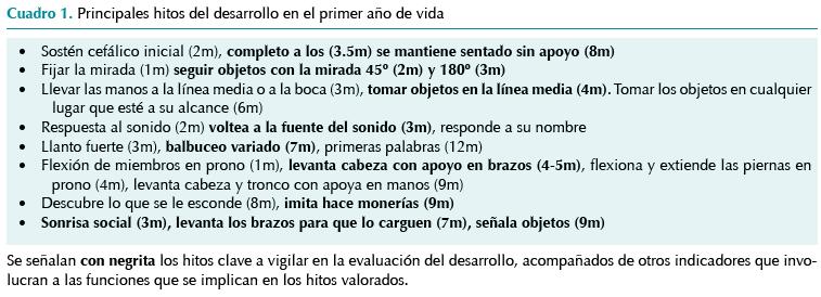 En nuestra experiencia, una adecuada apreciación del desarrollo requiere confirmar la presencia de esos hitos, que a su vez son parte de secuencias del desarrollo en edades clave. Estas conductas constituyen indicadores de la presencia de funciones centrales del desarrollo y son señal de integridad del sistema nervioso. La ausencia, retraso o expresión anómala de los hitos del desarrollo se encuentra asociada probabilística y funcionalmente con francas alteraciones en el desarrollo, no suelen corresponder a simples retrasos por pobre estimulación o experiencia de aprendizaje. (Cuadro 1)