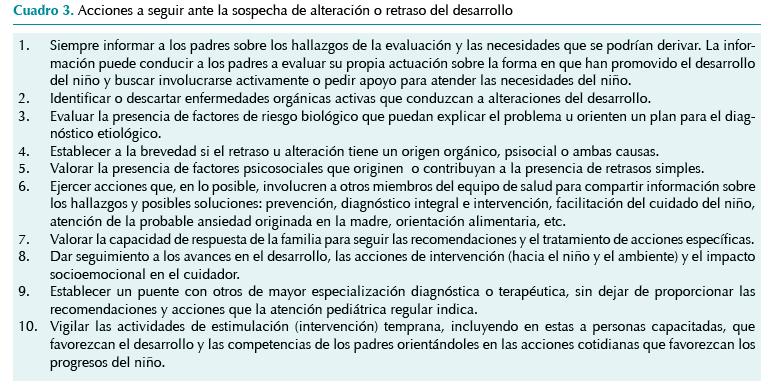 La implementación de prácticas de vigilancia y evaluación del desarrollo está relacionada con cierta claridad sobre las acciones a seguir al detectar retrasos o alteraciones. La vigilancia del desarrollo tiene un par indesligable que es la promoción del desarrollo y difícilmente una funciona sin la otra. La pregunta que acompaña a toda valoración es: ¿qué hacer si se detectan alteraciones en la evaluación del desarrollo? En el Cuadro 3 se presentan algunos criterios a seguir.