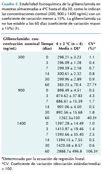 El límite de cuantificación para la metformina fue de 20 ng/mL y de 100 ng/mL para la glibenclamida. El límite de detección para la metformina fue de 5 ng/mL (proporción señal-ruido ≥ 3) mientras que para la glibenclamida fue de 25 ng/mL. Las muestras sanguíneas se pueden congelar y descongelar hasta tres veces, con recuperación media de 89% de metformina y 90% de glibenclamida, con un coeficiente de variación < 5% (datos no mostrados).